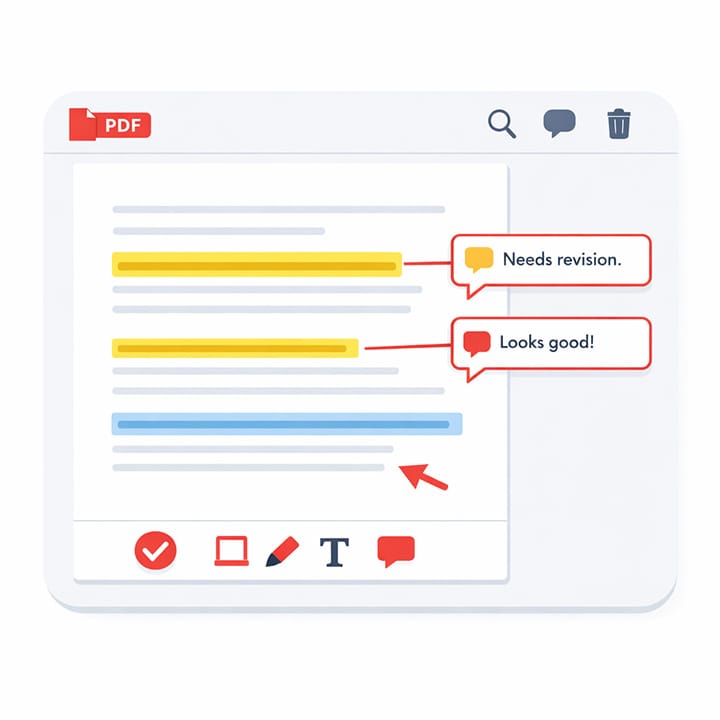 Добавляйте комментарии, заметки и выделения прямо в PDF-файлах. Вы можете подчёркивать важные фрагменты, оставлять правки и делиться замечаниями с коллегами, не изменяя исходный документ.